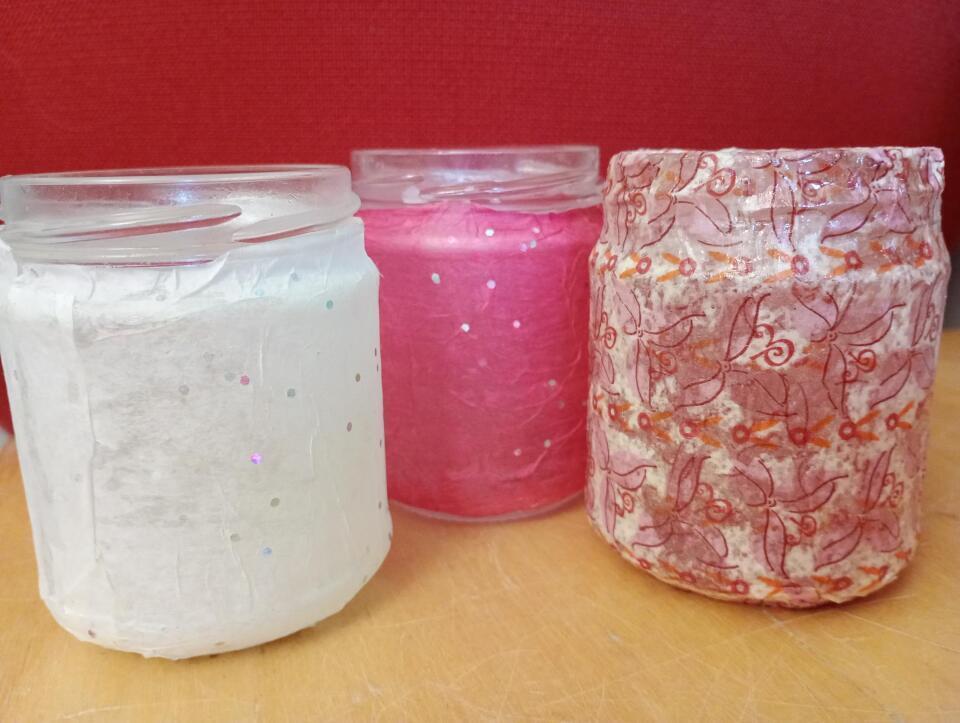 Vi finner frem syltetøyglass, farger og papir for å lage vår egen lykt.