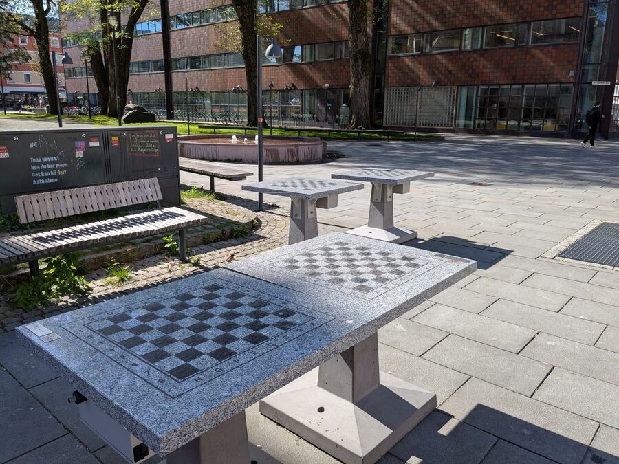 Utenfor hovedbiblioteket står det fire sjakkbord. Brikker kan du låne i barneavdelingen. (Foto: Reidar Bjorvatn)